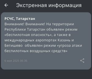 МЧС объявило угрозу атаки БПЛА в Татарстане